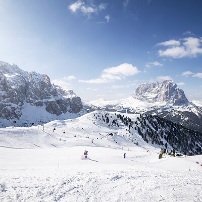 Nur einige Kilometer weiter liegt das Skigebiet Gröden/Seiser Alm den Dolomitengipfeln zu Füßen. Es verspricht absolute Wow-Aussichten und Abfahrten auf legendären Pisten.