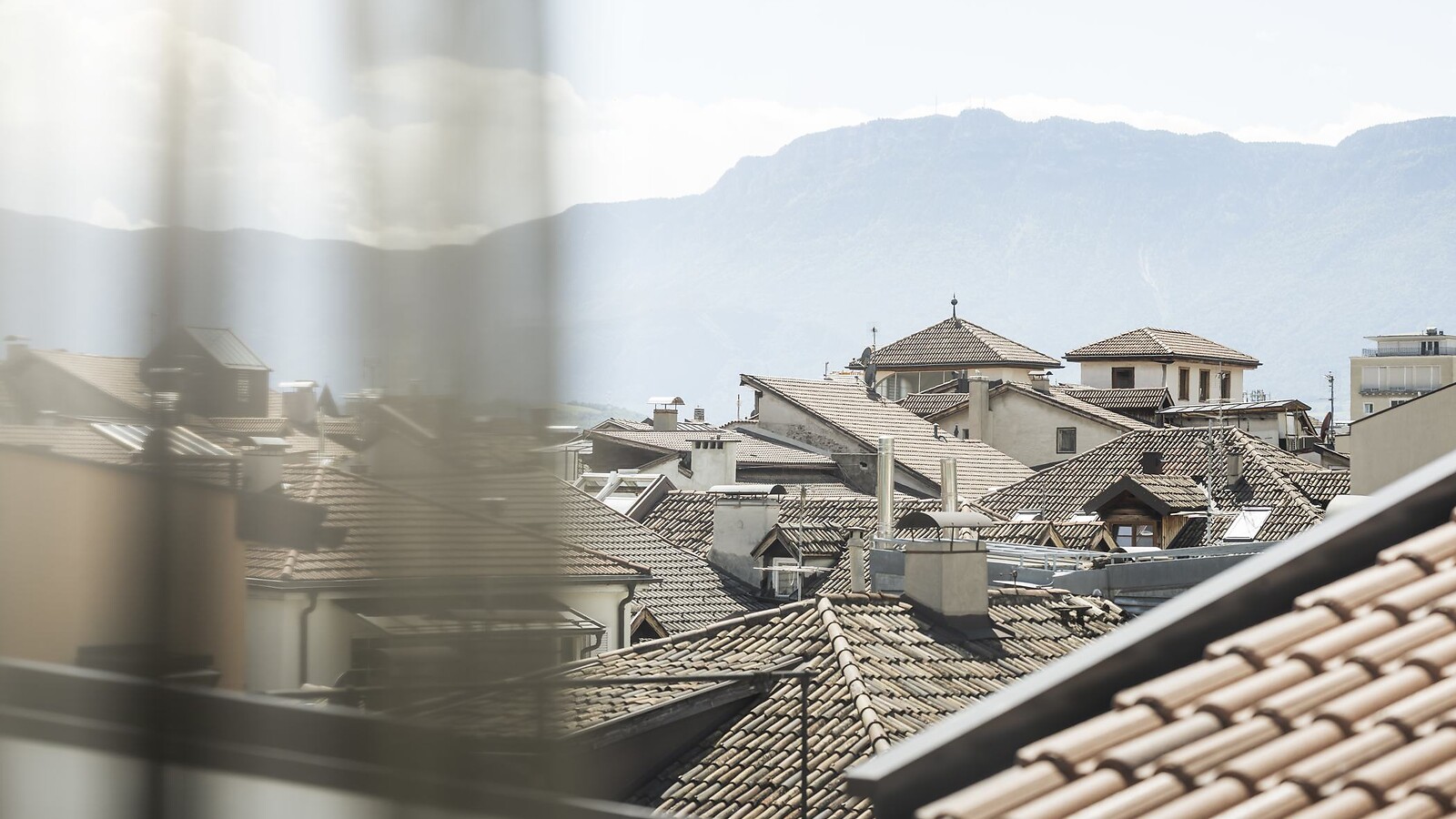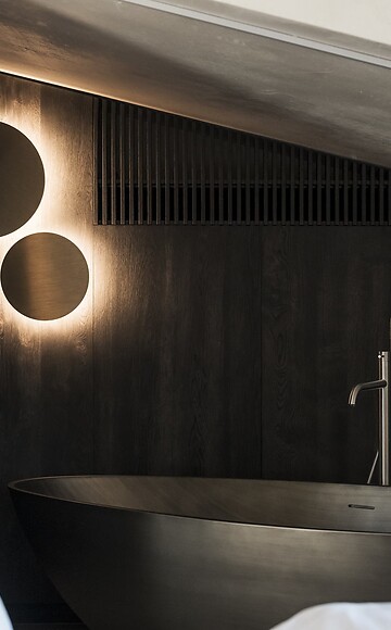As promising as its name sounds, staying in this suite is equally enchanting. Located exclusively beneath the mansard roof, it offers uninterrupted views over Bolzano’s rooftops. On the balcony, enjoy a prime spot to watch the evening light illuminate the peaks of the Catinaccio/Rosengarten, and in the bedroom, immerse yourself in the warm water of the free-standing bathtub. Elegant wood, clay plaster, and warm fabrics create a perfect atmosphere for discerning couples.